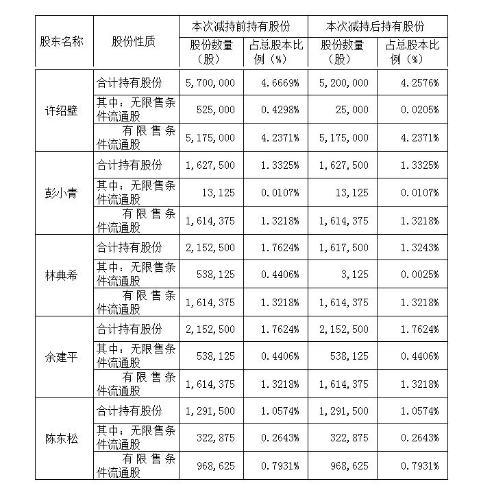 2、公司股東許紹壁、林典希通過集中競價(jià)方式減持公司股份,具體情況詳見公司于2019年11月4日在《中國證券報(bào)》、《上海證券報(bào)》、《證券時(shí)報(bào)》、《證券日?qǐng)?bào)》和巨潮資訊網(wǎng)(www.cninfo.com.cn)披露了《關(guān)于部分股東減持計(jì)劃數(shù)量過半的進(jìn)展公告》(公告編號(hào):2019-060)。