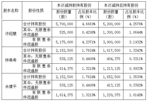 注:1、上表中已減持股東許紹壁、林典希、余建平本次減持后持有股份數(shù)量系根據(jù)《深圳證券交易所上市公司股東及董事、監(jiān)事、高級管理人員減持股份實施細則》規(guī)定“每年轉讓的股份不得超過其所持有本公司股份總數(shù)的百分之二十五”計算所得。