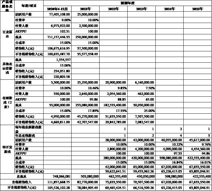 根據上述預測思路及計算模型,對標的公司2020年度4月1日至2025年度游戲項目主營業務收入進行了預測,2026年以后企業按2025年營業收入保持穩定進行預測。