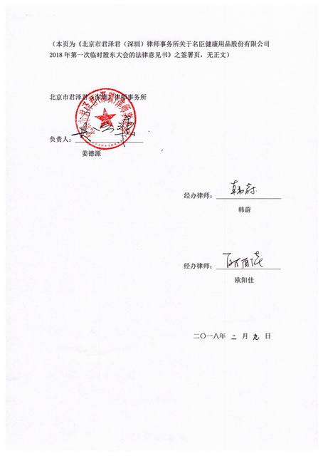 名臣健康用品股份有限公司(以下簡稱“公司”)2018年第一次臨時股東大會(以下簡稱“本次股東大會”)于201829日下午1330召開,北京市君澤君(深圳)律師事務所(以下簡稱“本所”)接受公司的委托,指派相關律師(以下簡稱“本所律師”)出席會議,并依據中國證券監(jiān)督管理委員會(以下簡稱“中國證監(jiān)會”)《上市公司股東大會規(guī)則》(以下簡稱“《股東大會規(guī)則》”)的要求發(fā)表法律意見并出具本法律意見書。