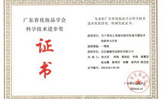 近日,名臣健康皮膚護(hù)理研發(fā)團(tuán)隊(duì)完成的“關(guān)于蒂花之秀蠶絲植語(yǔ)乳液關(guān)鍵技術(shù)的研究與開(kāi)發(fā)”項(xiàng)目,經(jīng)過(guò)專(zhuān)家委員嚴(yán)格評(píng)審,獲得廣東省化妝品學(xué)會(huì)科技進(jìn)步獎(jiǎng)一等獎(jiǎng)。