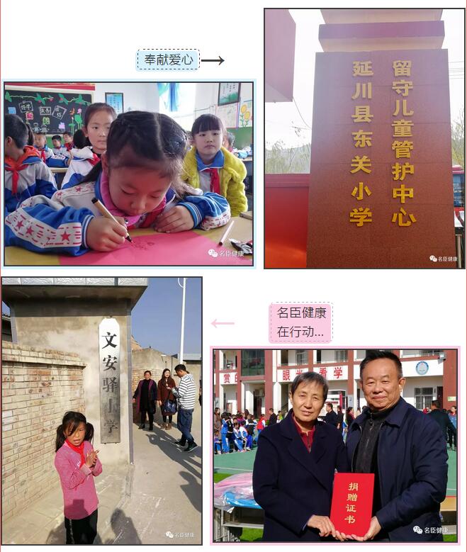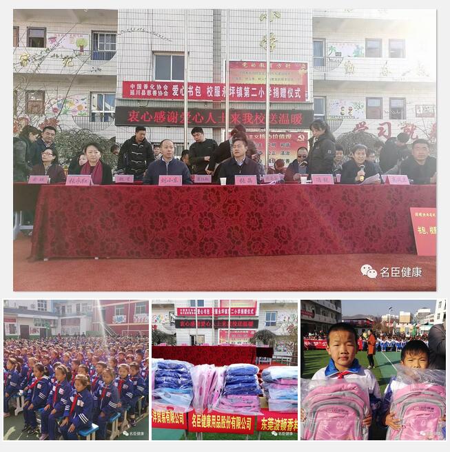 11月1日,名臣健康派出代表,遠赴陜北革命老區(qū)延川縣參加中國香料香精化妝品工業(yè)協(xié)會組織的“走進陜西-香化行業(yè)愛心書包校服公益活動”。為延川縣永坪鎮(zhèn)第二小學(xué)、東關(guān)小學(xué)、文安驛小學(xué)等學(xué)校和留守兒童管護中心捐贈愛心書包和愛心校服一批,以實際行動支持老區(qū)教育事業(yè),在這初冬時節(jié),為老區(qū)留守兒童奉獻拳拳愛心。