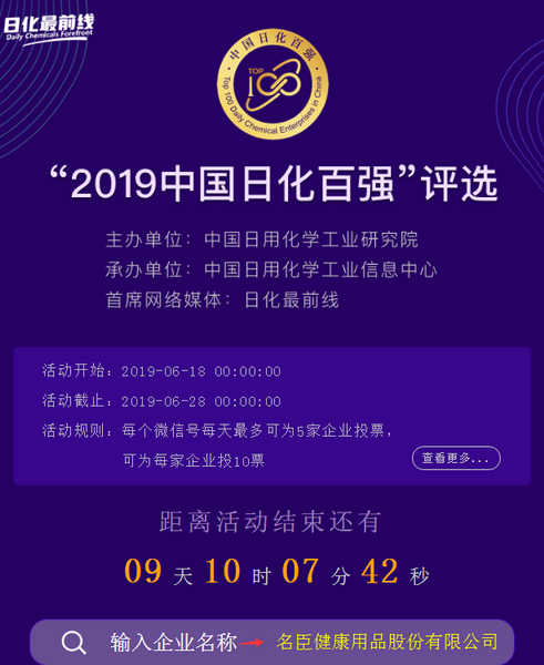 由中國日用化學工業研究院主辦的“中國日化百強”評選活動正在進行中,名臣健康用品股份有限公司,經主辦方審核確認,進入推薦網絡投票的企業名單,請您關注和支持名臣健康評選活動,為我們投上您寶貴的一票。謝謝!
