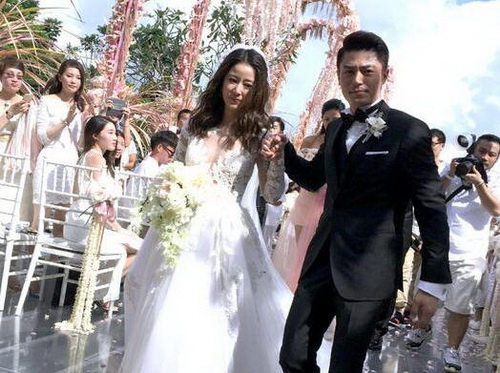 婚禮現場,林心如身穿白紗,披著一頭靚麗的秀發,挽起霍建華的手,幸福甜蜜。