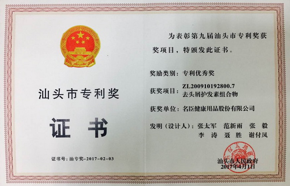 近日,公司發明專利“去頭屑護發素組合物”榮獲第九屆汕頭市專利優秀獎。