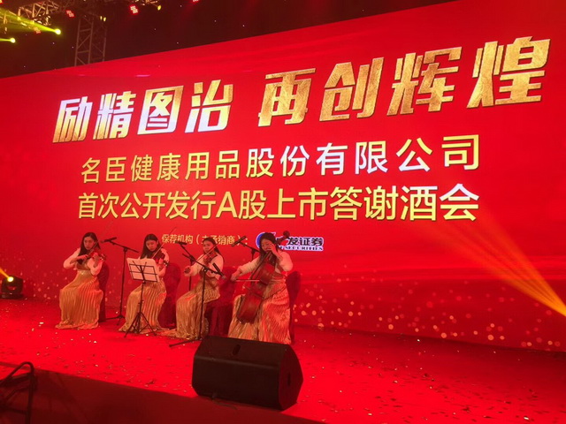 12月18日晚,名臣健康用品股份有限公司在深圳香格里拉大酒店隆重舉行“名臣健康首次公開發(fā)行A股上市答謝酒會”。