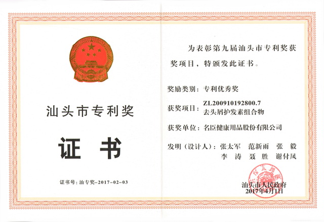 4月份,名臣健康憑借強大的自主創(chuàng)新能力、高新技術(shù)及自有知識產(chǎn)權(quán),申報汕頭市知識產(chǎn)權(quán)保護重點企業(yè)入庫,并順利通過,成為汕頭市第一批知識產(chǎn)權(quán)保護重點企業(yè)。在第九屆汕頭市專利獎評審和表彰活動中,名臣健康已授權(quán)發(fā)明專利“去頭屑護發(fā)素組合物”經(jīng)過專家評審及答辯,獲得了第九屆汕頭市專利獎優(yōu)秀獎。
