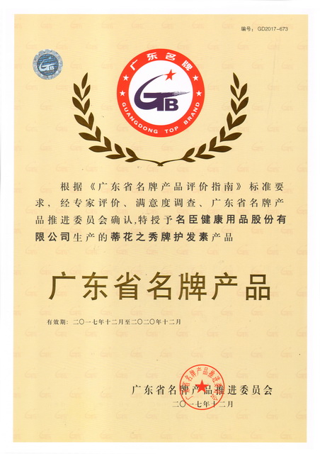 名臣健康用品股份有限公司繼之前“蒂花之秀沐浴露”獲國家質量監督檢驗檢疫總局頒發的中國名牌產品證書、“蒂花之秀護膚膏霜產品” 、“蒂花之秀洗發水產品”獲廣東省名牌產品證書之后,在昨天的2017年度廣東省名牌產品授牌大會上,又有“蒂花之秀沐浴露”與“蒂花之秀護發素”二個高新技術產品喜獲廣東省名牌產品授牌。